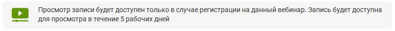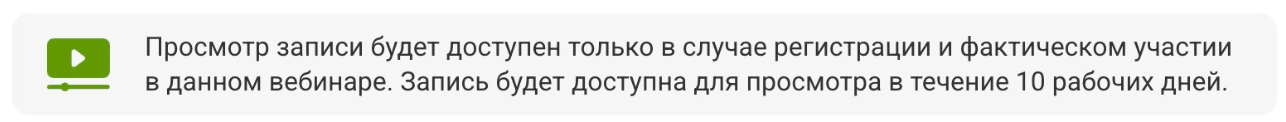 На странице самого вебинара вы найдете более подробную информацию о нем. Например, программа вебинара, дата завершения приема вопросов спикеру или уведомление о том, что запись вебинара не предусмотрена или доступна при наличии регистрации.
