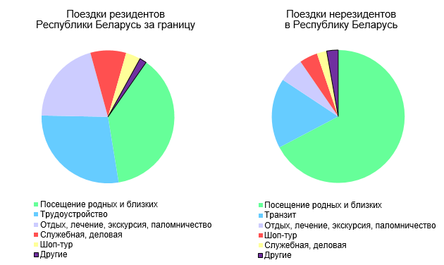 Основными целями поездок граждан Республики Беларусь, выезжающих за ее пределы, являлись посещение родных и близких (37,7% от общего количества заполненных анкет), трудоустройство (27,9%) и отдых, лечение, экскурсия, паломничество (религия) (20,4%). Для нерезидентов Республики Беларусь, въезжающих в нашу страну, – посещение родных и близких (67,3%) и транзитный проезд (17%).