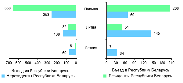 В Республику Беларусь в это же время через автодорожные пункты пропуска въезжали преимущественно резиденты Литвы (48%), Польши (18,2%), Российской Федерации (10,9%) и Латвии (8,9%).